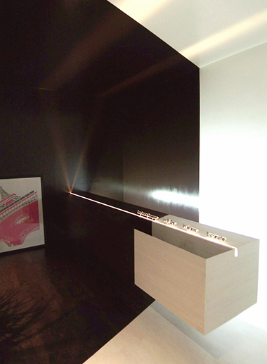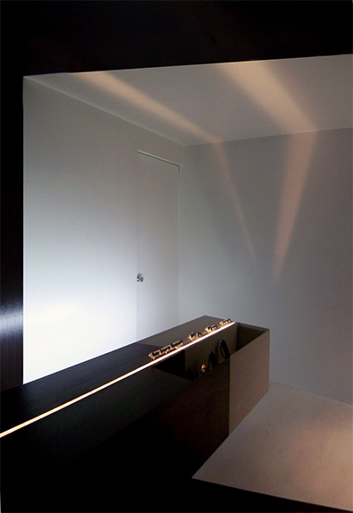 浮遊したカウンター上面のライン状から出たひかりは、ツートンカラーの空間に2本のひかりを映し出し、カウンター自身の存在価値を、己の身体と空間に植え付けます。